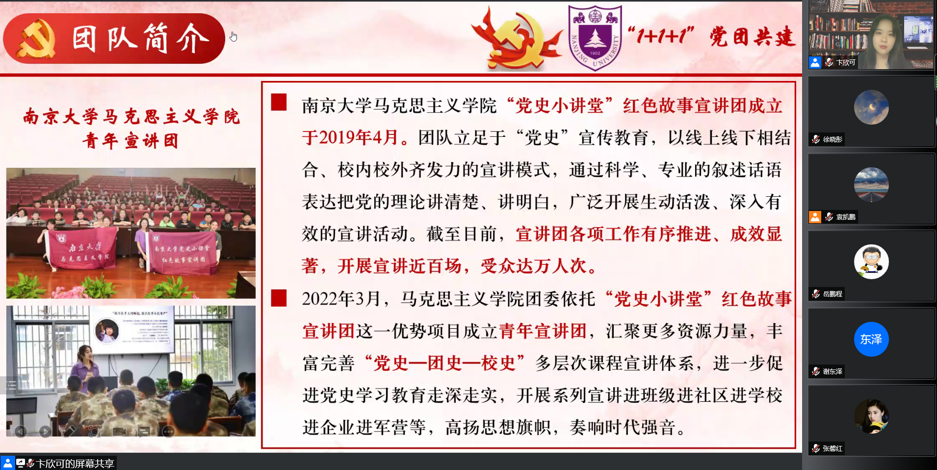 首先,我院优秀校友、2017级政治学与行政学专业本科生、现南京大学马克思主义学院2021级硕士研究生第二党支部丛政同学分享南京大学马克思主义学院青年宣讲团“党史—团史—校史”多层次课程宣讲体系以及“线上线下相结合、校内校外齐发力”宣讲模式。