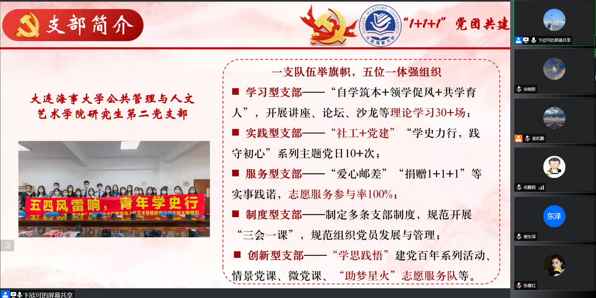 支部书记黄梦茜同学介绍支部“南北追思”、“五校共建”特色学习活动,其中“实学辅德”、“力学笃行”、“益友同行”三大主题党课版块为各支部提供了有益启发和丰富借鉴。支部王世亨同学以共青团百年发展历史中的“变”与“不变”为脉络,带领同学们深入了解共青团在百年发展历史中的变化。