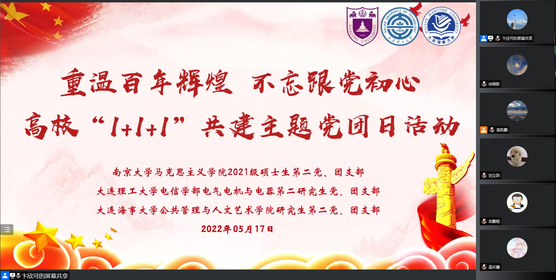 为深入学习贯彻习近平总书记在中国人民大学考察时重要讲话精神和在庆祝中国共产主义青年团成立100周年大会上的重要讲话精神,5月17日,公共管理与人文艺术学院研究生第二党支部联合南京大学马克思主义学院2021级研究生第二党支部、大连理工大学电信学部电气电机与电器研究生第二党支部线上开展“1+1+1”联学共建主题党团日活动。三所高校党支部依托各自学科、专业特色,围绕支部相关活动,交流、分享党史学习教育与基层党组织建设经验体会。