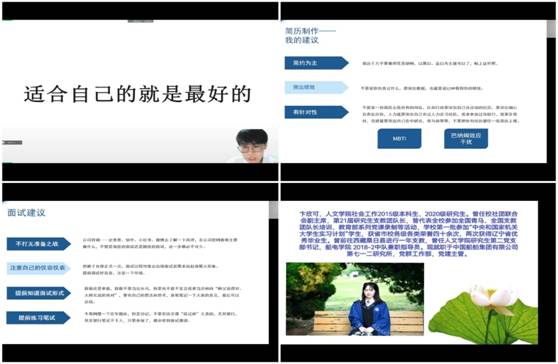 为全方位提升学生就业能力,我院大学生党员服务中心邀请2018级行政管理专业刁鹏宇、龚佳乐与2020级社会工作专业研究生卞欣可同学分享就业经验。