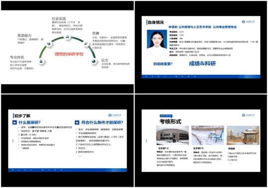 陈奉润分享行政管理专业的学习心得与方法,并详细讲述保研具体流程;林袁影结合自身保研经历,重点分析如何提升核心竞争力,并为大学生活提出多方面建议;郎家暄从保研条件、加分项、重点条件、具体流程四个方面出发,为同学们讲述保研注意事项。