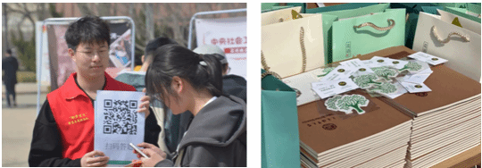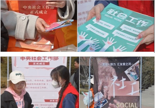 社会工作专业的同学、学院“助梦星火”党员志愿服务队的队员以及驻站社工们身着马甲,手持精心制作的宣传海报,在中心食堂前的广场细心地为大家介绍着社工的专业作用、社工站的功能特点和“五社联动”的积极意义。