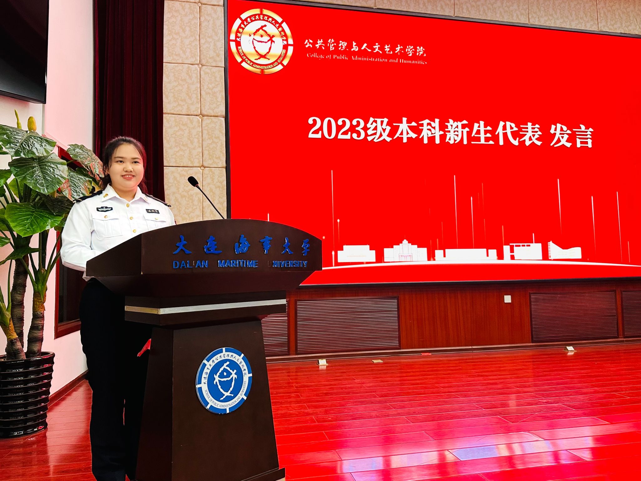 新生代表姜虹羽发言,表达对人文精神的深切思考和担当时代重任的决心,号召同学们传承红色精神勇担时代使命,实现蓝色梦想,牢记“海汇泉溪,人聚群力”的院训,争做新时代人文精神的先锋兵!