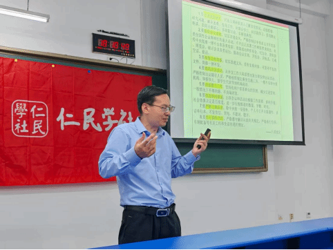 学院院长储建国面向仁民学社学生开展“絜矩之道,知行之法”党课讲座。他深入解读了“絜矩之道”,并以此为切入点,引领学生从党的自我革命维度认识中央八项规定精神的重大意义,并从良知与致知、规矩与方圆、修行与体悟三个方面进一步阐释治国之道与自我修炼的辩证关系。