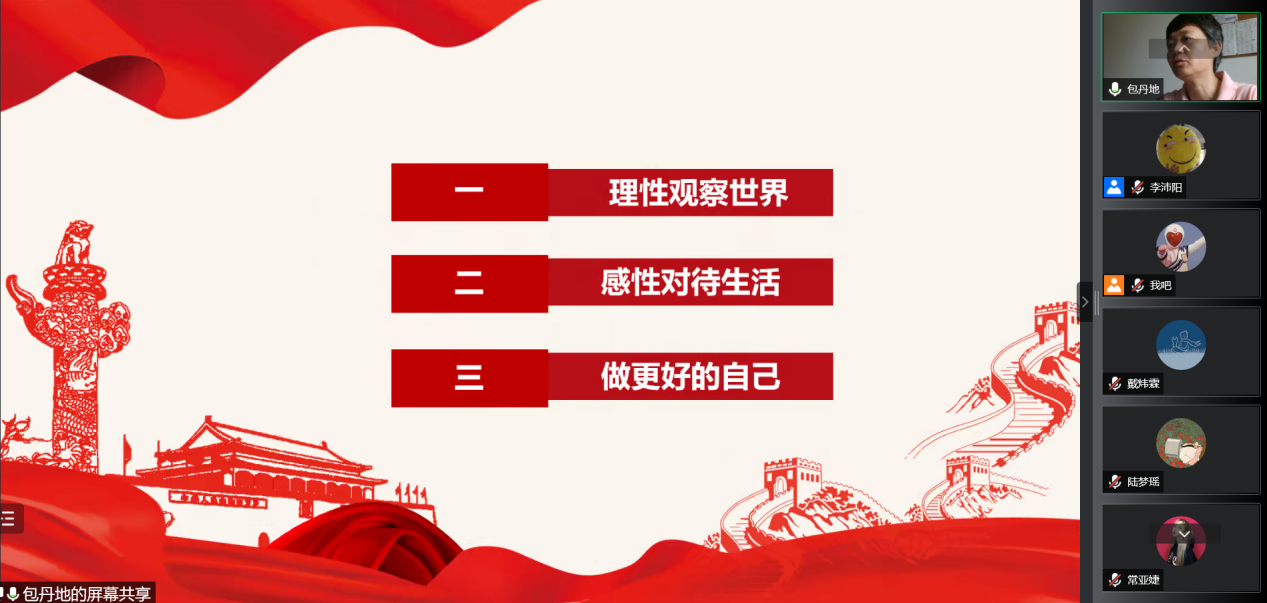 首先,包丹地带领全体党员回顾了当前世界正处于百年未有之大变局,每名学生亦克服了种种困难,并对学生在疫情封校期间思想不乱、学业不断的优异表现予以充分肯定。