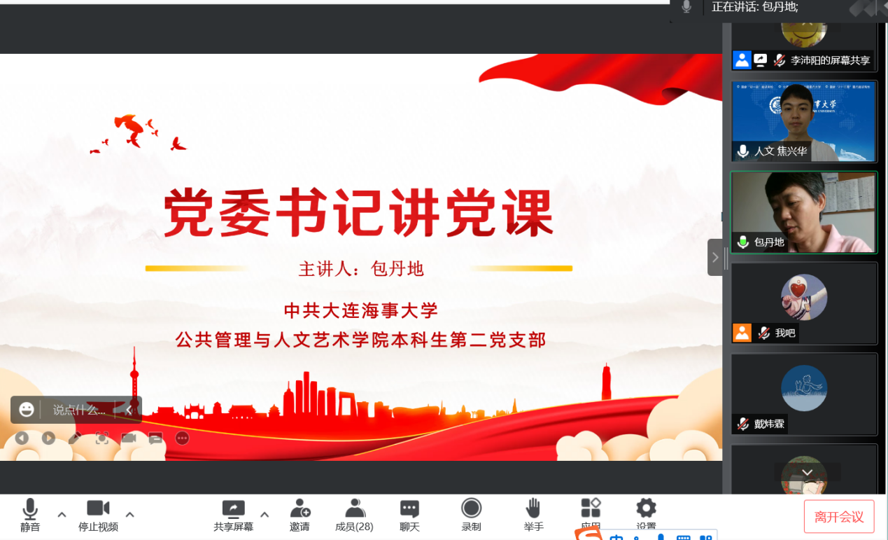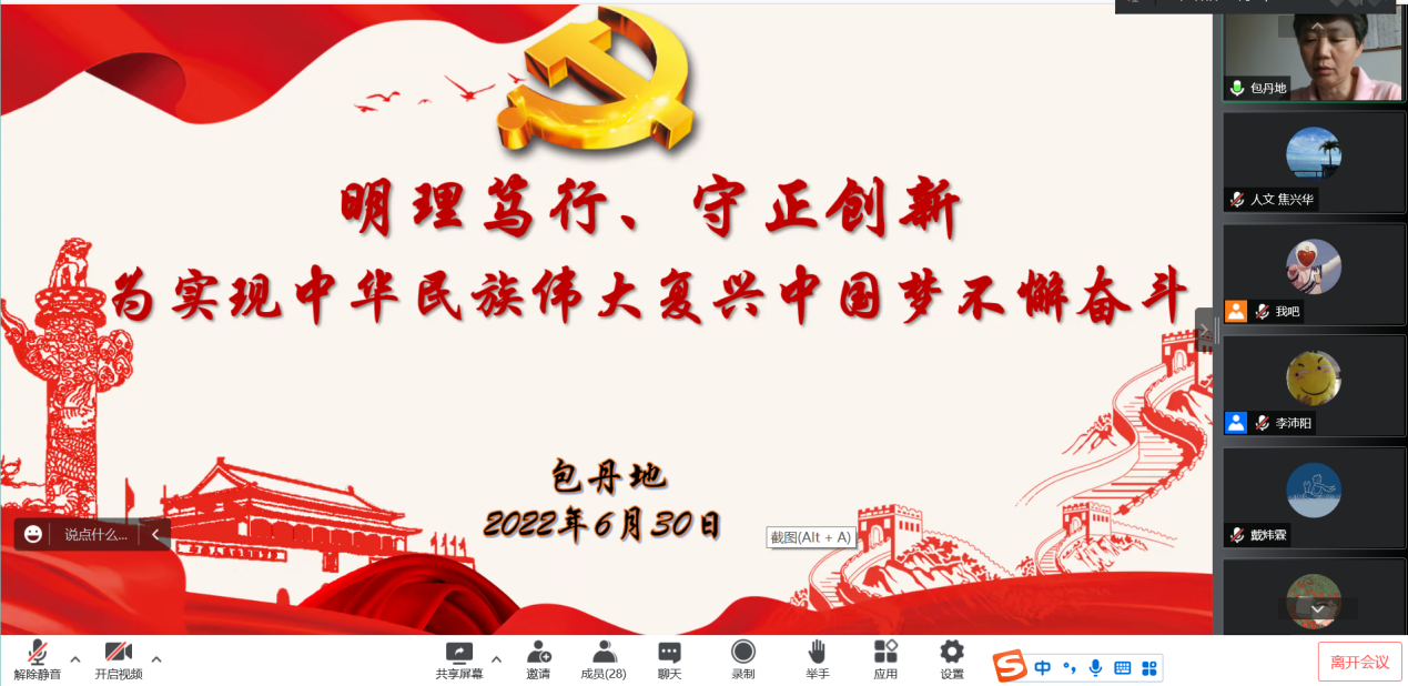 为进一步加强对广大青年理想信念教育,激励全体党员有所作为,6月30日,公共管理与人文艺术学院党委书记包丹地深入本科生第二党支部,开展题为“明理笃行、守正创新——为实现中华民族伟大复兴的中国梦不懈奋斗”的专题党课。活动通过线上授课形式,由支部书记焦兴华主持,本科生第二党支部全体党员聆听党课。