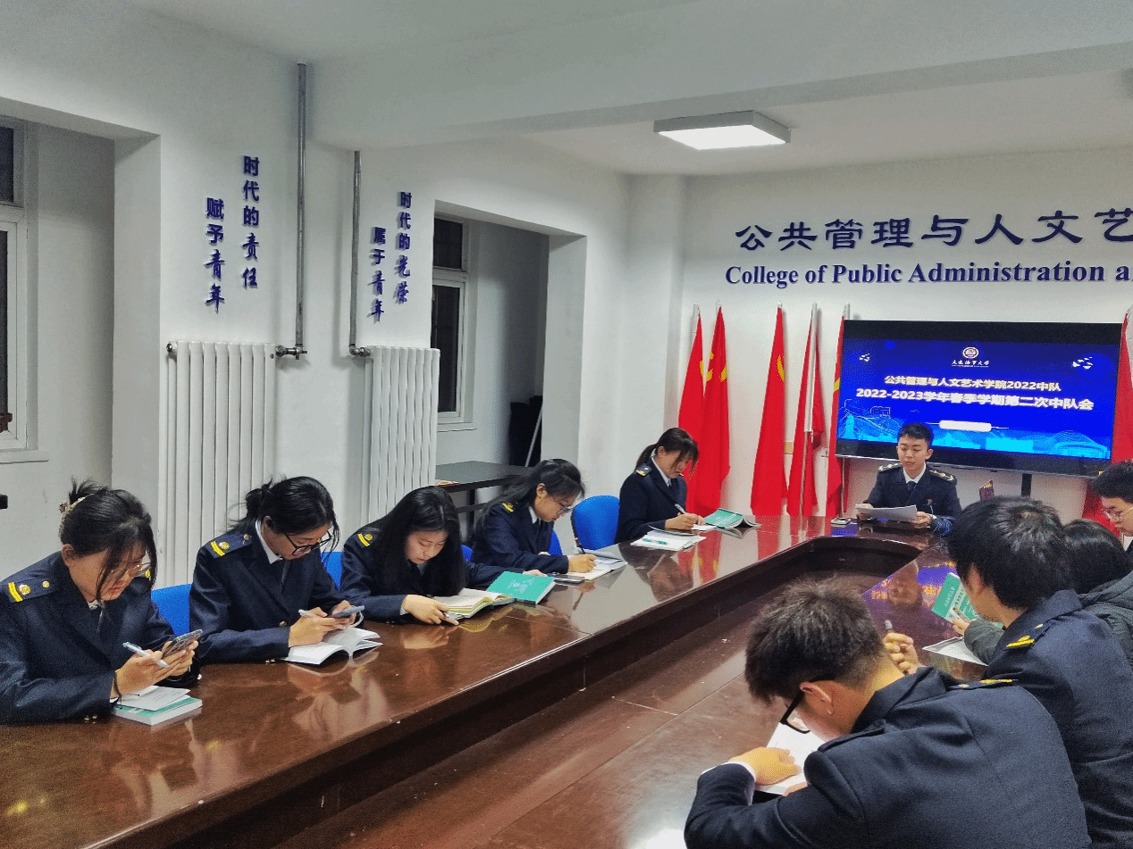 学期中旬临近,为夯实学风建设基础,推动学生养成良好生活作息习惯,公共管理与人文艺术学院2022中队于2023年4月17日以线上形式开展4月主题中队会。会议由中队指导员焦兴华主持,中队副指导员、中队长、团总支副书记、中队学习委员、中队纪律委员于线下参会,全体同学于线上参会。