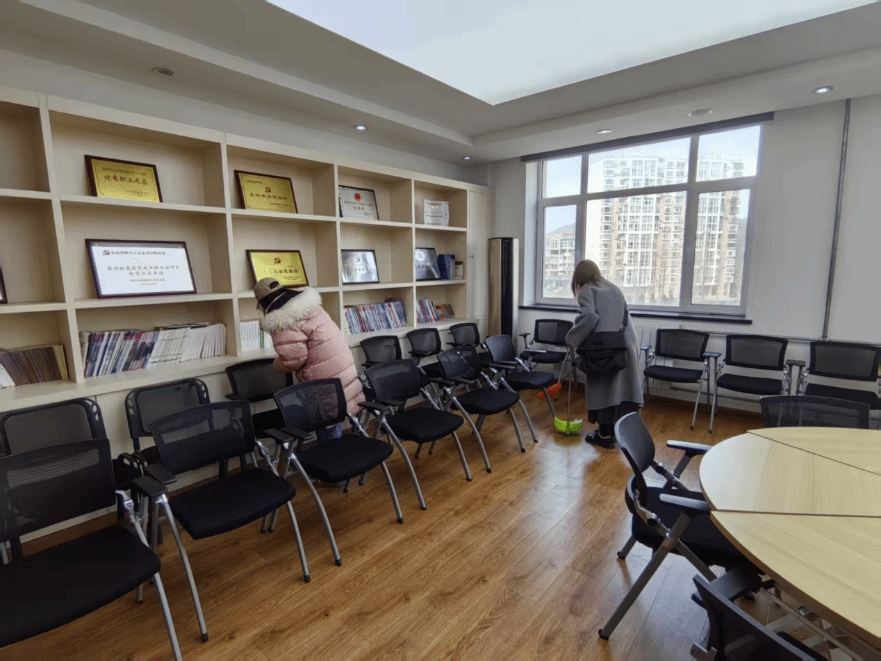 社会工作专业的同学们于5月7日带着劳动工具前往管理楼进行会议室和库房等空间打扫,他们扫地、拖地、擦桌子、擦窗户,同时把会议室的桌椅摆放整齐。很快,他们便打扫完成,同学们感到十分自豪,同时也受到了老师们的赞赏。