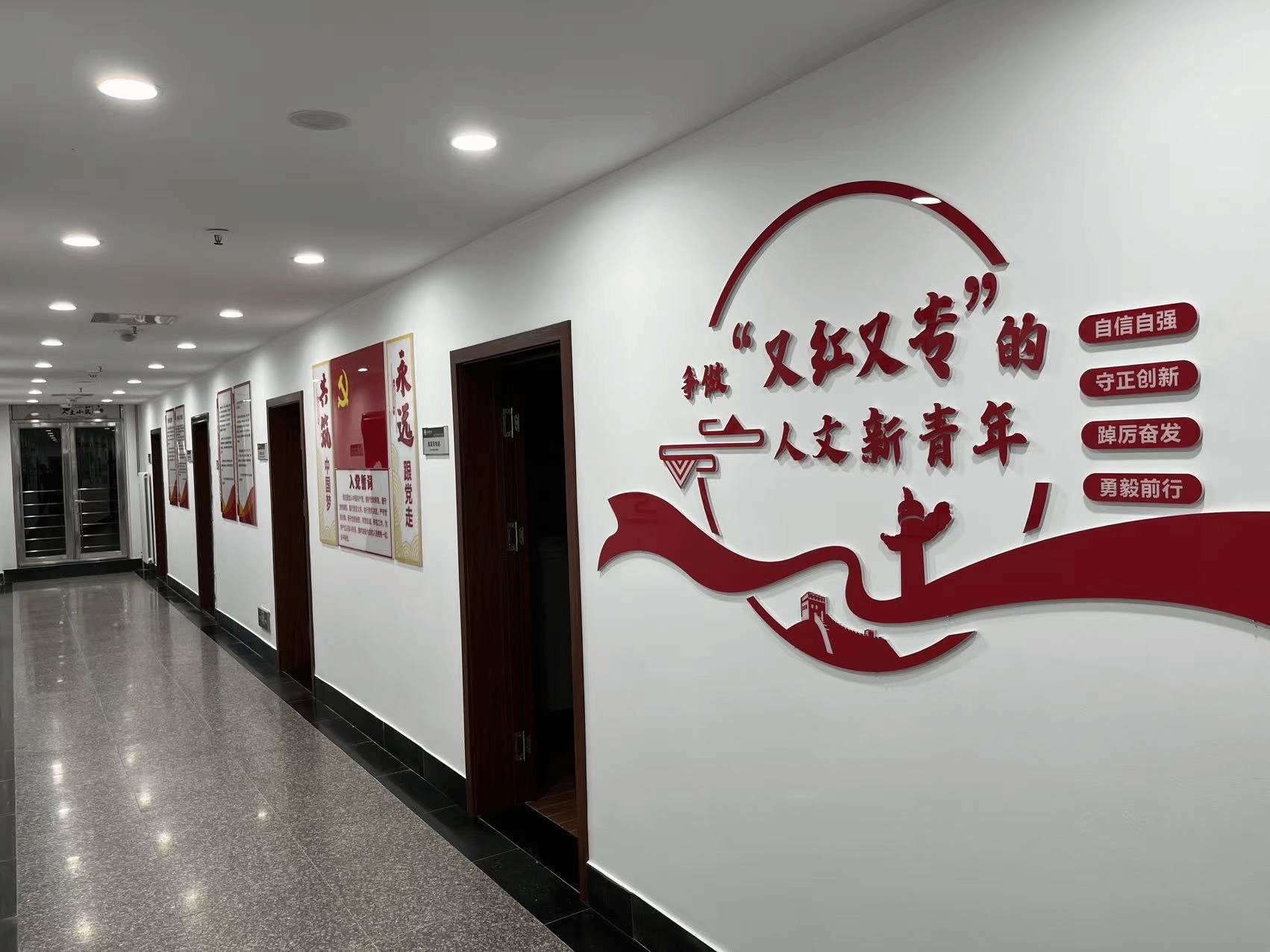 经过数日努力,原本单调的宿舍长廊摇身一变,成为了充满文化气息与艺术魅力的展示空间。北侧一面为红色文化展区,打造“红色”阵地,宣传党史等红色精神,旨在培养又红又专的人文新青年,激励同学们奋勇向前;南侧一面为学生工作展区,介绍威廉概况和院训院徽,展示学院学工风采与学生成长足迹,增进学生对学院的了解。