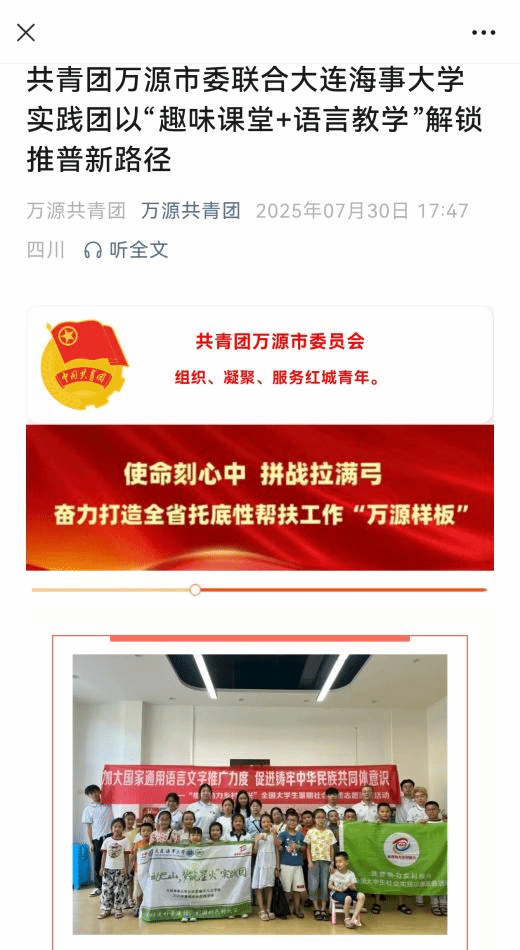 为贯彻落实习近平总书记在全国教育大会上的重要讲话和关于语言文字的重要指示批示精神,加大国家通用语言文字推广力度,引导人文学子为中国式现代化贡献青春力量,william威廉中文组建“声动巴山,梦筑星火”实践团,前往四川省达州市万源市开展社会实践活动。此次活动反响热烈,受到共青团万源市委官方报道,获万源市古东关街道和相关社区一致好评。