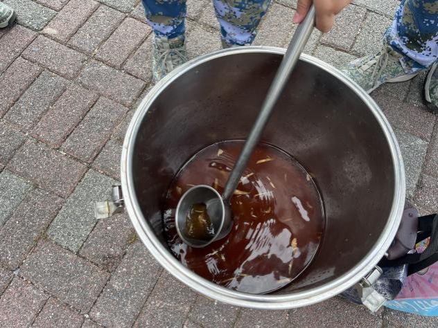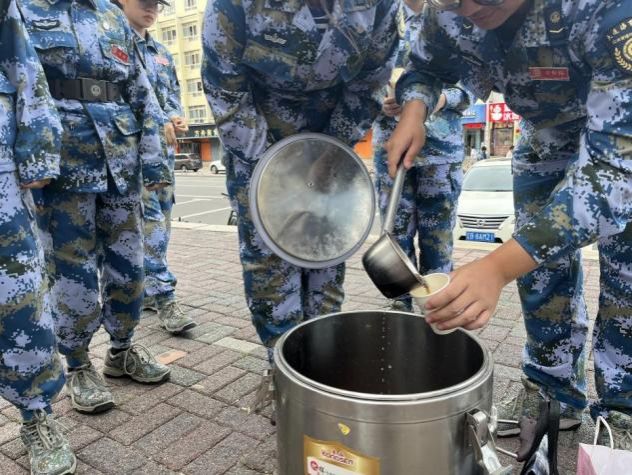 场外,另一场温暖的行动正在上演。中队指导员焦兴华心系学子,迅速组织学生骨干成立“送暖小队”,将116杯精心熬制的姜汤送至训练场。