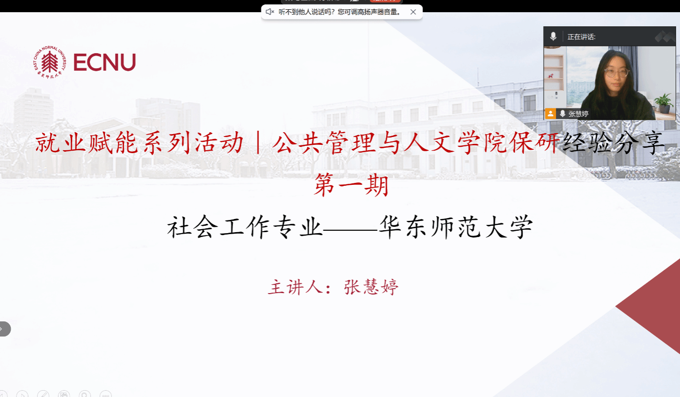 张慧婷同学则保研至华东师范大学,她从文书撰写、导师联系等细节方面入手,为同学们提供了实用的建议。她提醒同学们要认真准备个人陈述和推荐信,突出自己的优势和特色,同时要主动与目标导师沟通,了解导师的研究方向和需求。