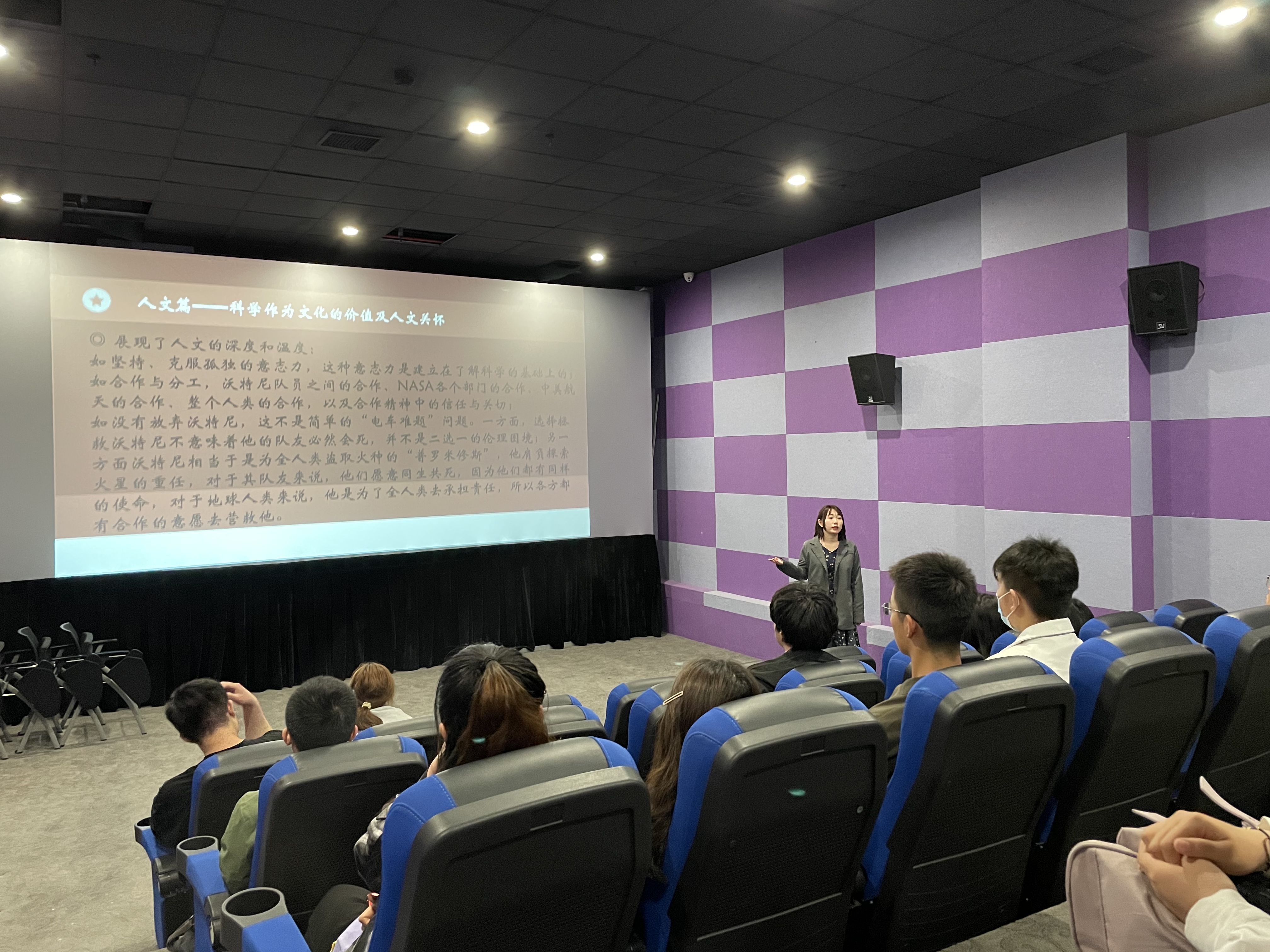 活动伊始,同学们一同观看了影片。电影放映结束后,付楚幽首先介绍了同名小说创作者——科幻作家安迪·威尔(Andy Weir),详细介绍了作者本人扎实的科学素养。她表示,虽然电影力求事实精确,但在一定程度上还是为了戏剧效果牺牲了科学理论的真实性,并引导同学们以批判的态度去认识电影情节。此外,付楚幽就电影主人公的硬核科学知识给予了充分肯定,并希望同学们不断夯实自身的科学知识水平,培养杰出的动手能力。当论及电影本身所展现的文化价值及人文关怀时,付楚幽结合作者创作这部作品的着手点进行讲解,并表示,作者自身对于人类天性中的团结协作精神给予了充分肯定,同时正是这种团结协作精神,也使这部影片中处处展现了科学作为文化的温情和价值。